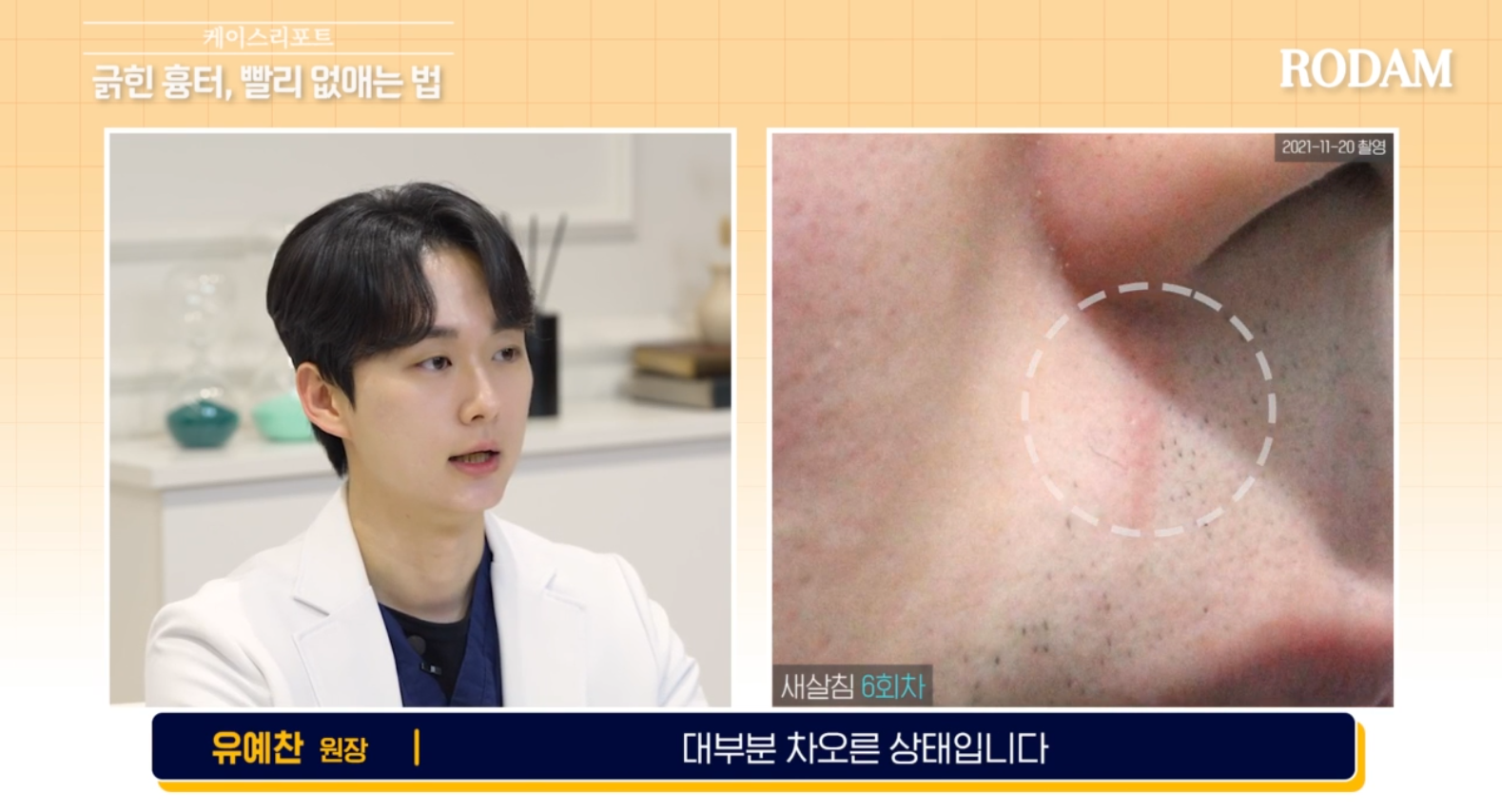 흉터는 인중 옆에 위치해 약 1.5cm 정도로 길게 패인 상태였죠.