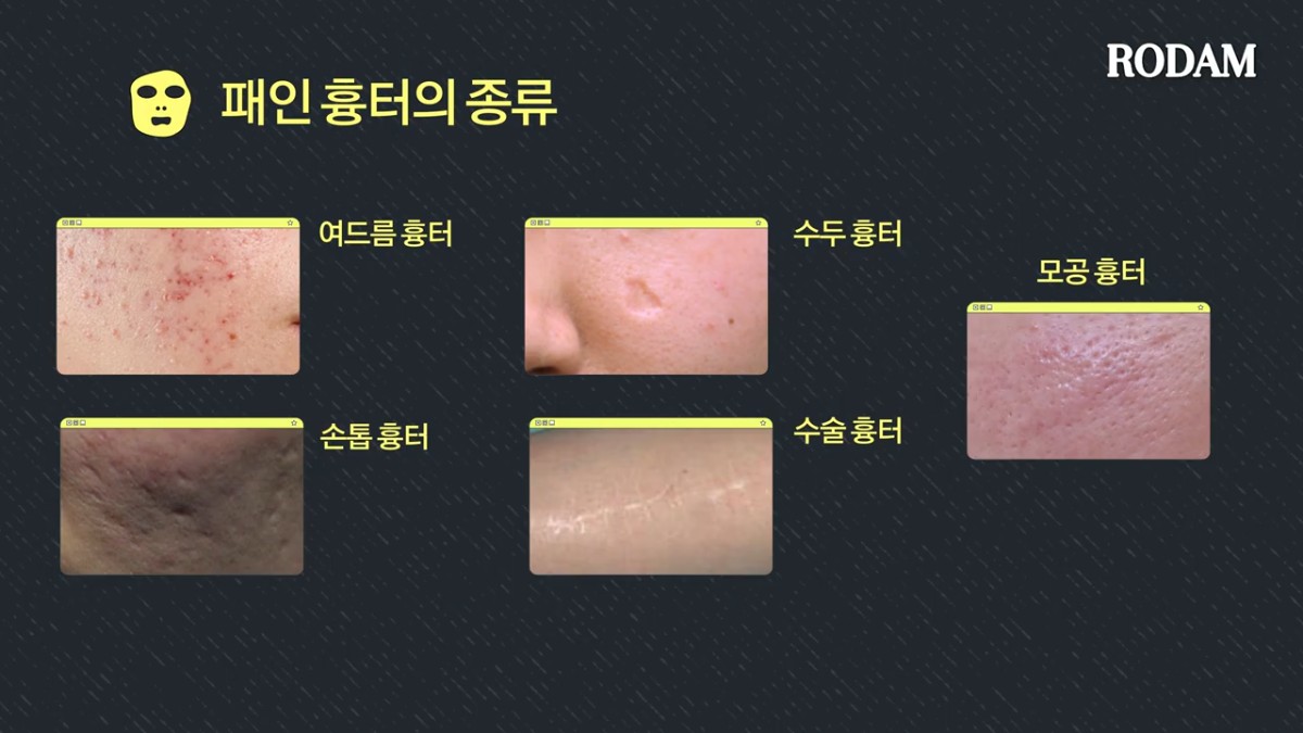 여드름 흉터, 수두 흉터, 손톱 흉터, 수술 흉터, 모공 흉터 등