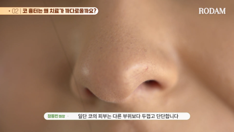 먼저 코 피부는 다른 부위보다 두껍고 단단한 특성을 가지고 있어 치료 과정에서 반응이 더디고 회복도 쉽지 않습니다.